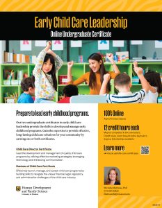 Our 100% Online Undergraduate Certificates in Early Child Care Leadership provide you with the skills to develop, lead, and manage high-quality early childhood programs. Enroll in one or both of our 12-credit certificates to gain the expertise needed to provide effective, long-lasting child care solutions for your community.